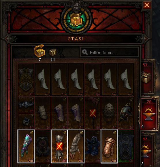 Numbers represent search results. Total number of gloves in your stash 7 + 14 and number of gloves found in each of your stash folder. Search will also find items in inventory and those dressed on a hero.